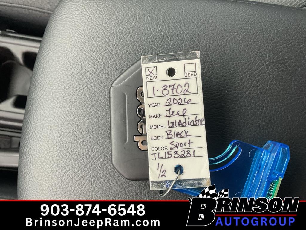 2026 Jeep Gladiator Sport S — 4WD, V6 3.6L Gasoline — Corsicana TX Ready for worksite duty and weekend adventures, this 2026 Jeep Gladiator Sport S pairs rugged capability with modern tech. Equipped with a powerful V6 3.6L gasoline engine and rock-solid 4WD, the Jeep Gladiator Sport S delivers confident towing, dependable off-road traction and a smooth on-road ride. The Off-Road Package expands capability with enhanced suspension and terrain-ready features, so you can tackle trails, gravel and rough roads with confidence. Inside, enjoy seamless smartphone integration with Apple CarPlay and convenient Hands Free Bluetooth® for calls and audio streaming. Safety-focused features include Forward Collision Warning to help avoid incidents and a Back-Up Camera for easier parking and maneuvering in tight spaces. Practical bed space and versatile towing capacity make this Jeep Gladiator ideal for hauling gear, tools or recreational equipment. Located in Corsicana, TX, this Jeep Gladiator Sport S is priced to move — offering the best price in the area for a 2026 model with this equipment level. Whether you need a daily driver that can handle rough roads or a weekend warrior for outdoor escapes, this Jeep balances capability, comfort and modern convenience. Contact us in Corsicana, TX to schedule a test drive and secure this best-priced 2026 Jeep Gladiator Sport S today.